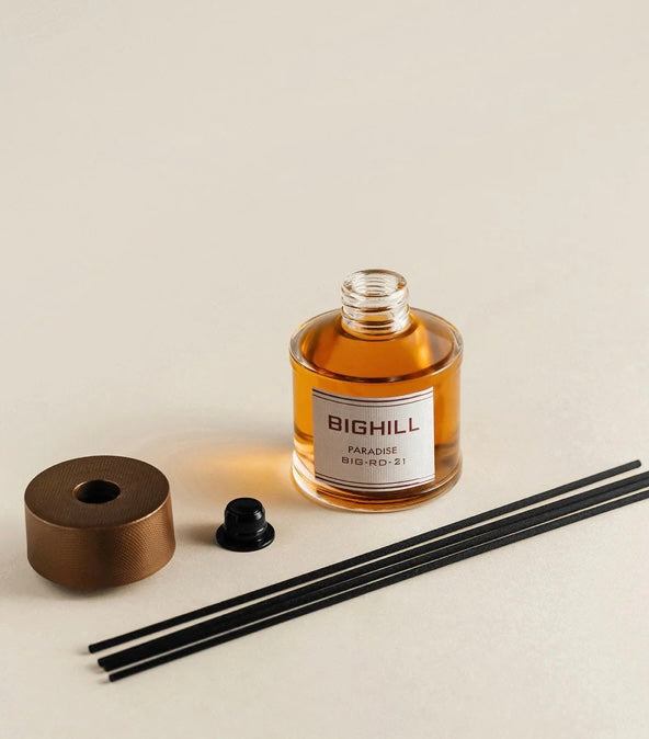 Bighill Paradise is a fruity-floral scent, described as a fresh and warm blend that evokes summer. It features top notes of apple and lemon, a middle of magnolia and rose, and a base of sandalwood and musk. The fragrance aims to provide a relaxing effect, filling a space with freshness and warmth through its delicate mix of fruits and florals.